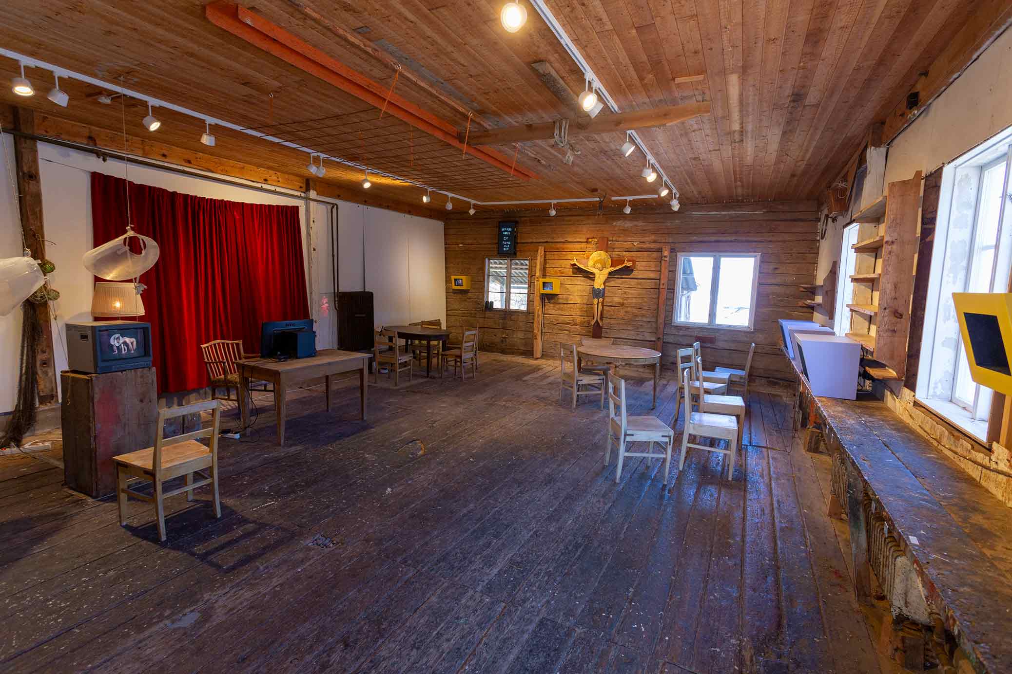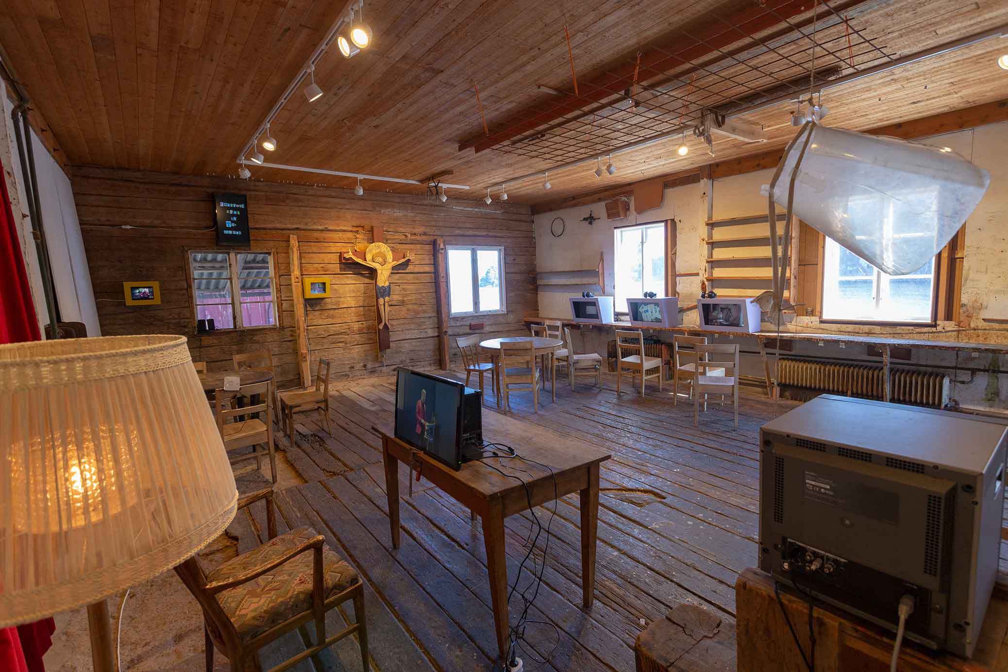 Exhibition in the Icelandic pavilion at the rural Alma Löv Museum of unexp. art. Some of the works shown are the animation All The Dead I Have Seen, the video sculpture Nesting Box, the sound piece Meditation Tape, the crucifix and the outdoor sound sculpture Balancing The Books.