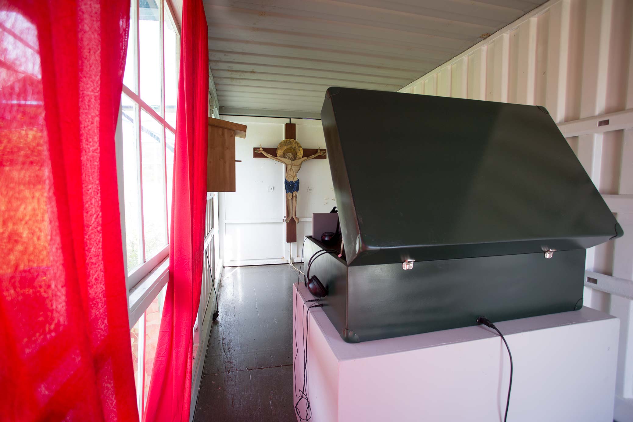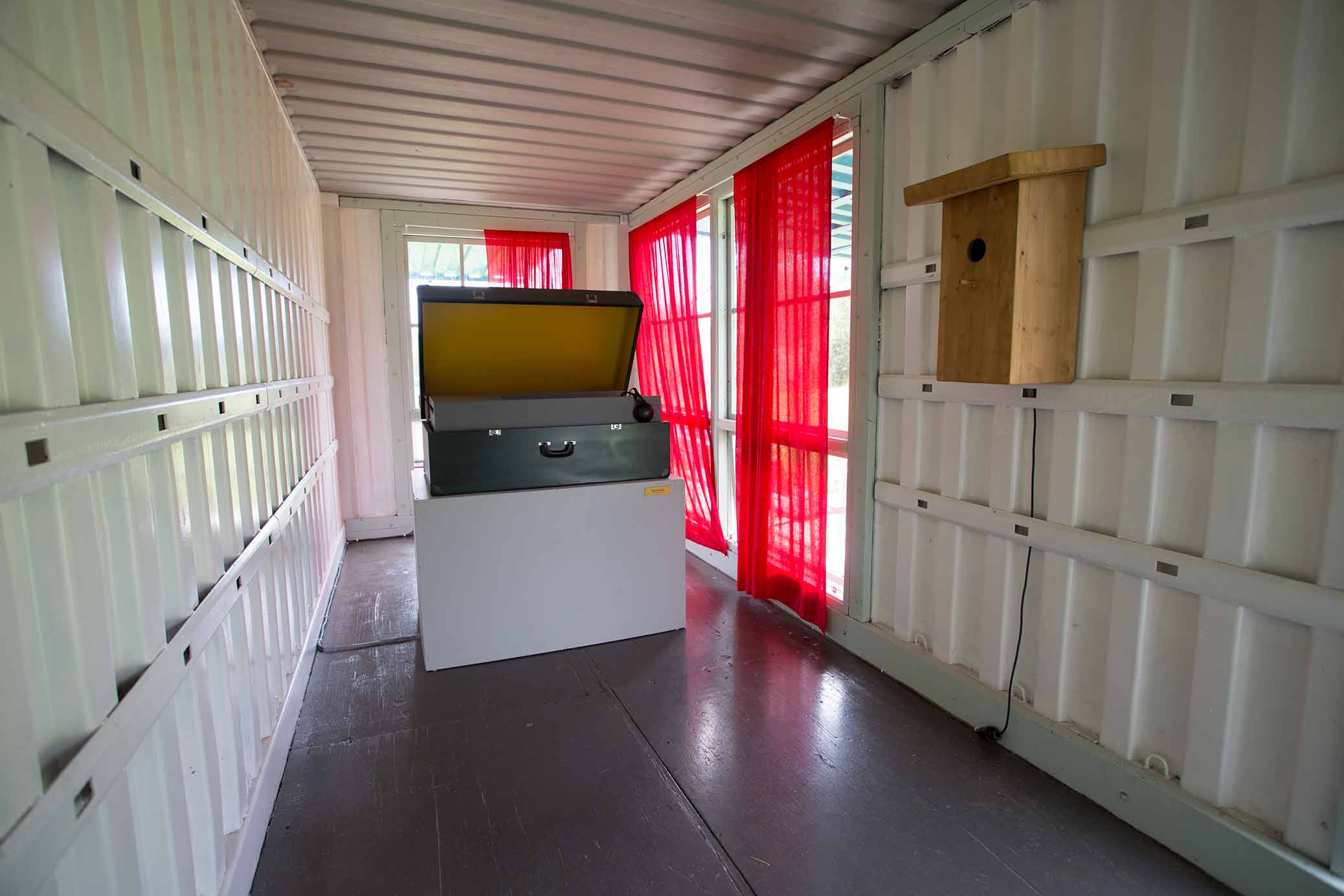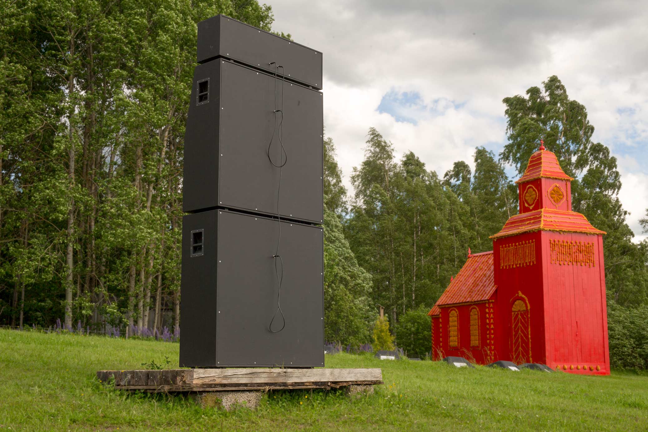 Exhibition in the Icelandic pavilion at the rural Alma Löv Museum of unexp. art. Some of the works shown are the animation All The Dead I Have Seen, the video sculpture Nesting Box, the sound piece Meditation Tape, the crucifix and the outdoor sound sculpture Balancing The Books.