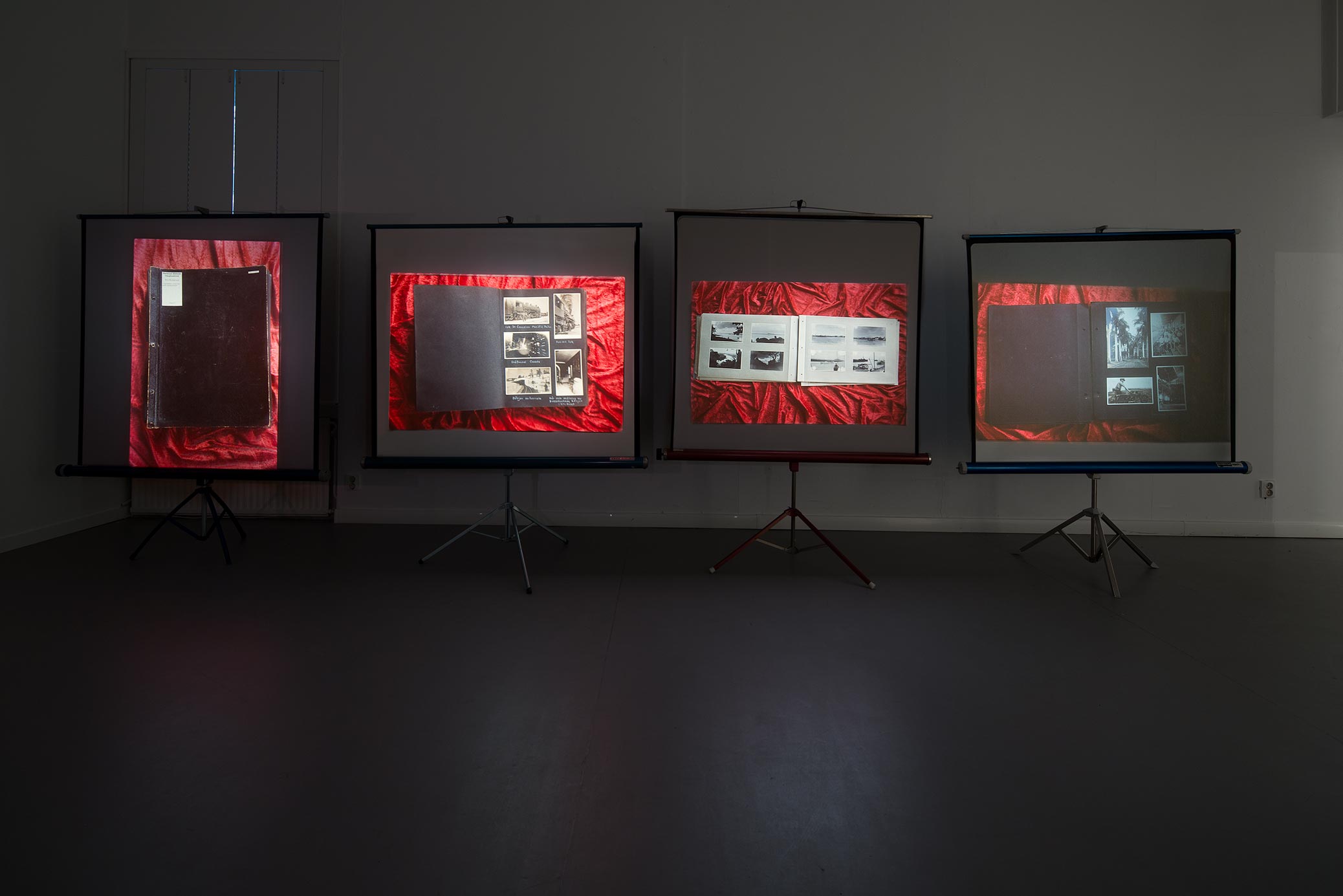 Technique: Archive photographs, swivel frames, book, trunk, videos, wallpaper, slide projections