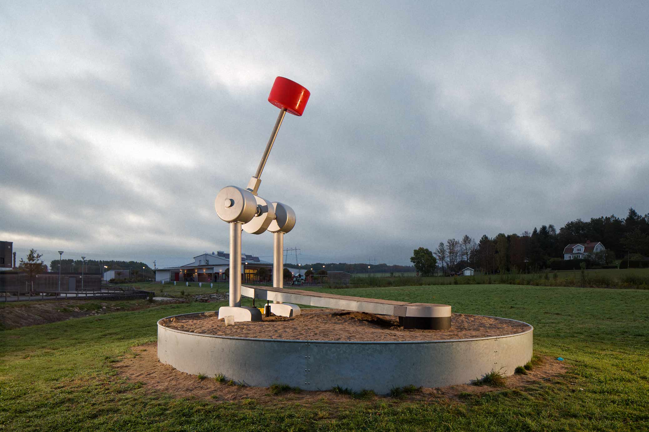 Världens största bastrumspedal är nästan fem meter hög. Det är en interaktiv skulptur med rörliga delar. När skulpturen beträds och sätts i rörelse ger den ifrån sig ett oväntat och rogivande klockaktigt ljud. Placerad på en äng framför två skolbyggnader bjuder den in till interaktion och aktiverar området mellan grundskolan och förskolan.