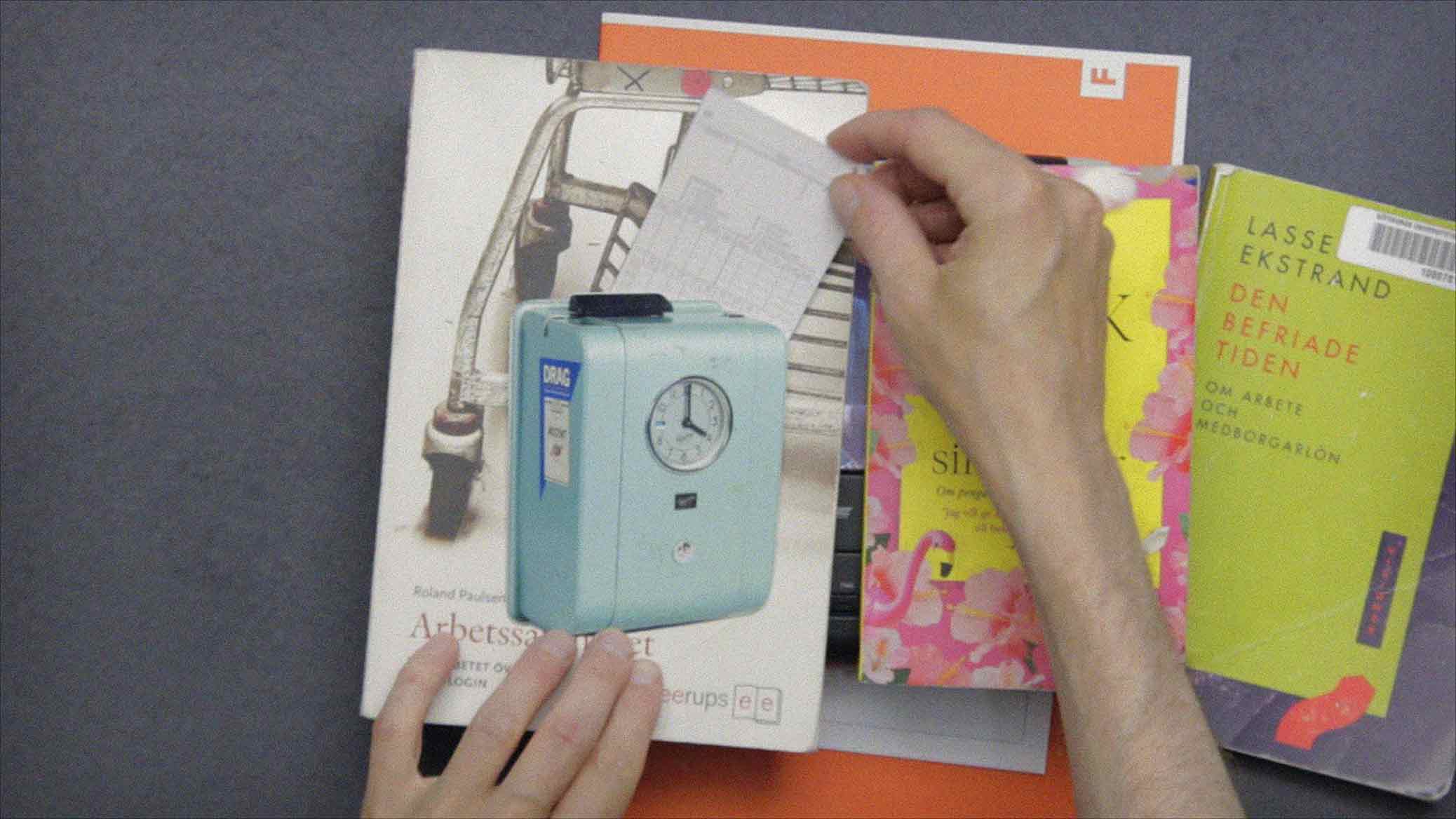 Procrastination, film still by Björn Perborg, time clock and books.