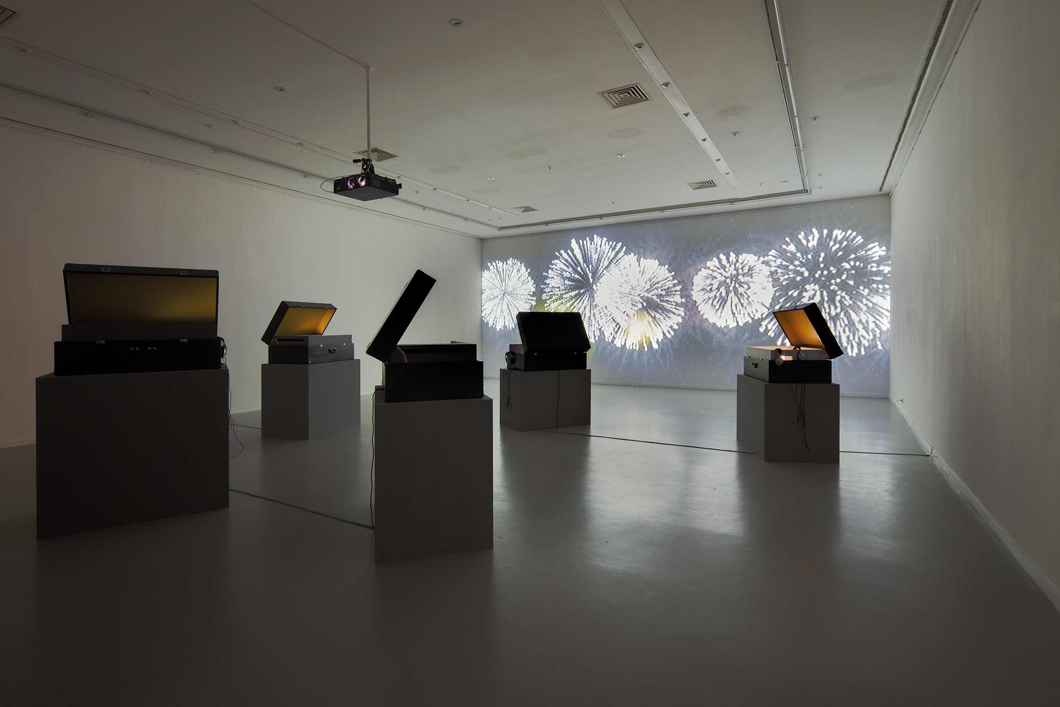 Finally, a two channel video installation is completing the show. It is »Immigrant Song«, in which, on one screen, Berlin-based drummer Hannes Lingens plays a variation of the drum groove from Led Zeppelin’s »Immigrant Song« using firework rockets as drumsticks. On the other screen fireworks on a night sky go off in synchronization with the drumbeats from the first screen.