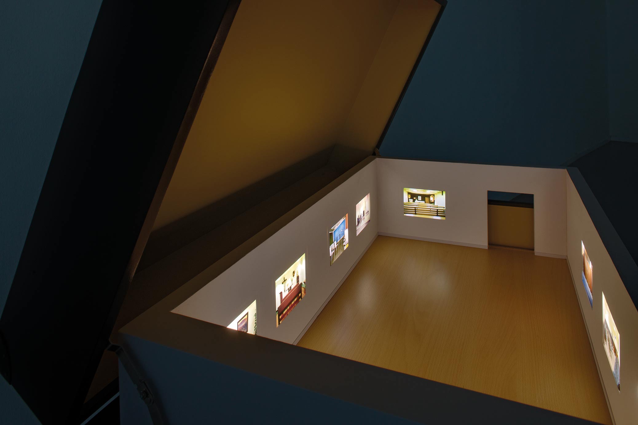 Material: Plywood, beslag, tyg, färg, lcd-skärmar, mediaspelare, foto, led-ljus, video, animation