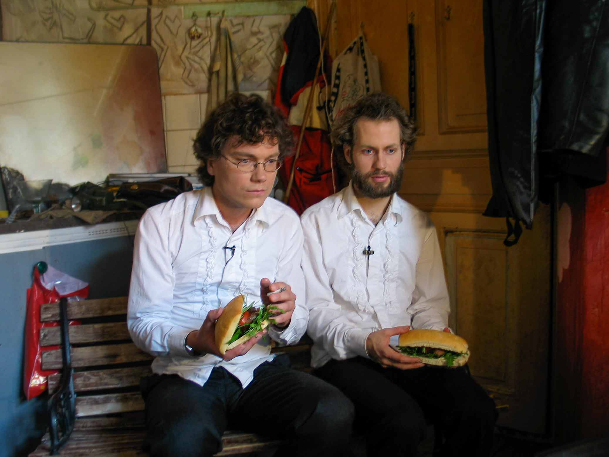 In the pilot, »Cross over«, television chefs Frans and Björn cook a three course dinner: shrimps, dill cooked in red wine and served with white beans in tomato sauce, Swedish Falukorv sausage baked with walnuts and eggs flambé in cognac served with whipped cream. The kitchen is very messy and unclean. All over the place you see cook books, tooth brushes, a human skull and artists material – adding character to the already fashionably grimy environment. As a viewer you see creative cooking in the act but can also recognise something of your own attempts at domestic gastronomy.